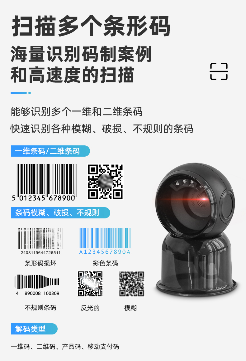 MS-7310_桌面掃碼平臺有線式 產(chǎn)品特點(diǎn): 領(lǐng)先解碼技術(shù) 采用自主研發(fā)的核心技術(shù),極速響應(yīng), 支持快速開發(fā)和定制需求 高運(yùn)動容差 采用全局曝光鏡頭搭配快速抓取技術(shù),可實(shí) 現(xiàn)在運(yùn)動過程中快速讀取 褶皺殘缺碼優(yōu)化 對褶皺和殘缺條碼進(jìn)行算法優(yōu)化,條碼可識讀率更高 紙質(zhì)碼/手機(jī)碼流暢切換 商品碼紙質(zhì)碼和手機(jī)支付碼間自動切換,流暢高效 應(yīng)用場景: 新零售、檢票、醫(yī)療等桌面設(shè)備。尤其適合零售商品碼和其他高密、反光、殘缺、褶皺條碼的運(yùn)動中讀取。