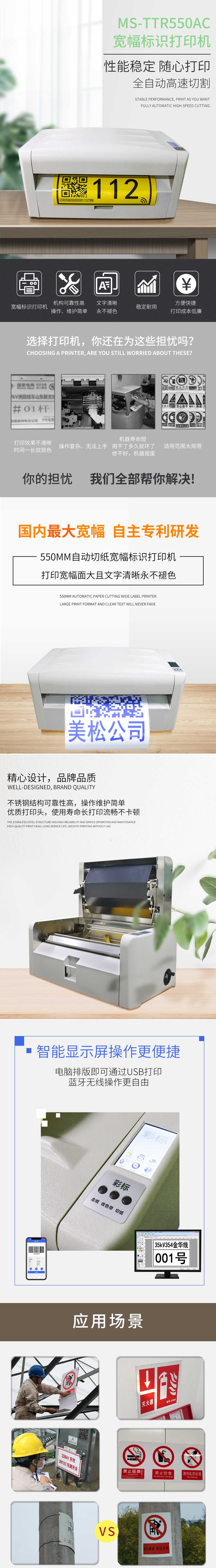 美松MS-TTR550AC熱轉(zhuǎn)印標(biāo)識(shí)標(biāo)牌打印機(jī)是針對(duì)寬橫幅印刷且自動(dòng)切割的設(shè)備.熱轉(zhuǎn)印設(shè)備能打印pvc不干膠紙,pvc標(biāo)簽紙,pvc標(biāo)牌紙,pvc電纜標(biāo)牌,復(fù)合材料封面,熱轉(zhuǎn)印機(jī)采用碳帶熱轉(zhuǎn)印方式打印,打印幅面大且文字清晰耐刮永不褪色.電腦排版完即可通過(guò)USB打印無(wú)需制版,方便快捷.機(jī)構(gòu)可靠性高,操作,維護(hù)簡(jiǎn)單.