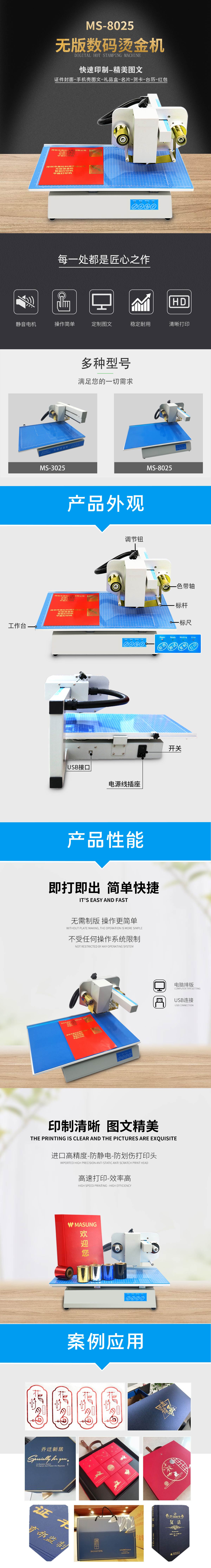 美松無版數(shù)碼燙金機(jī)MS-8025采用日本原裝rohm打印頭,最新設(shè)計徹底取代傳統(tǒng)的燙金機(jī)。身材小巧、節(jié)約空間重量、方便移動;最大打印厚度可達(dá)30mm、用途廣泛。軟件控制、可加工復(fù)雜圖案文字照片等,可在不光滑的卡紙、皮革上燙印各種圖案文字。用戶無需制版、開模,功率低,經(jīng)濟(jì)快捷,簡單操作,一看即懂,輕松自如。