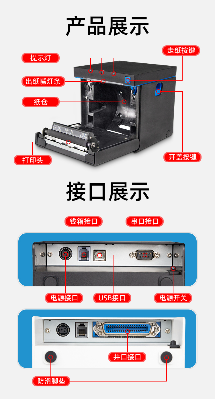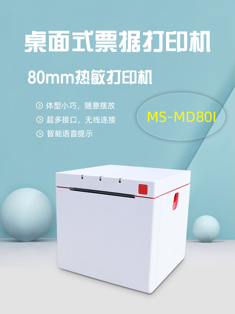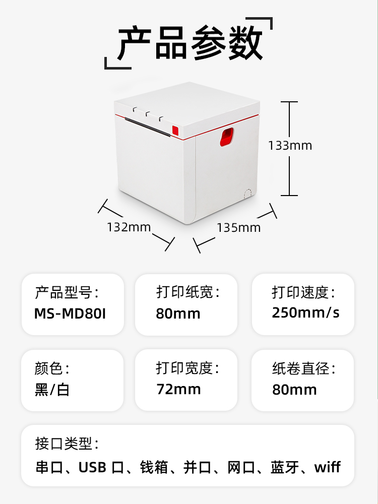 MD80I是一款高顏值的可桌面也可壁掛的票據(jù)打印機。MD80I外形四四方方的,圓潤一體設(shè)計、簡于外,精于內(nèi)。流線造型,外觀簡潔大方。顏色搭配顯得更加干凈整潔,可內(nèi)嵌于一些自助ai設(shè)備上,也可直接進(jìn)行使用。MS-MD80I是一款全能的桌面式壁掛式票據(jù)打印機,適用于零售商超、中小電商、倉儲物管、影院娛樂等行業(yè)領(lǐng)域,支持簡體/繁體、英/日/韓文多種國際語言,新零售、跨境電商、影院更適合。MS-MD80I擁有超高速打印速度,采用高級強勁機芯,打印速度可高達(dá)250MM/S成為市面上同類產(chǎn)品中快速打印的佼佼者,清晰穩(wěn)定與高速皆可兼得帶來顧客滿分體驗。MS-MD80I擁有豐富的可選接口,支持RS232串口、USB、網(wǎng)口,可選配藍(lán)牙、WiFi等接口、同時支持24V錢箱接入、滿足不同的連接需求。專業(yè)黑標(biāo)定位功能,前出紙打印,無線連接,藍(lán)牙接口連接,WiFi接口連接,USB連接,打印機外殼材質(zhì)高端,內(nèi)置機芯打印速度快。