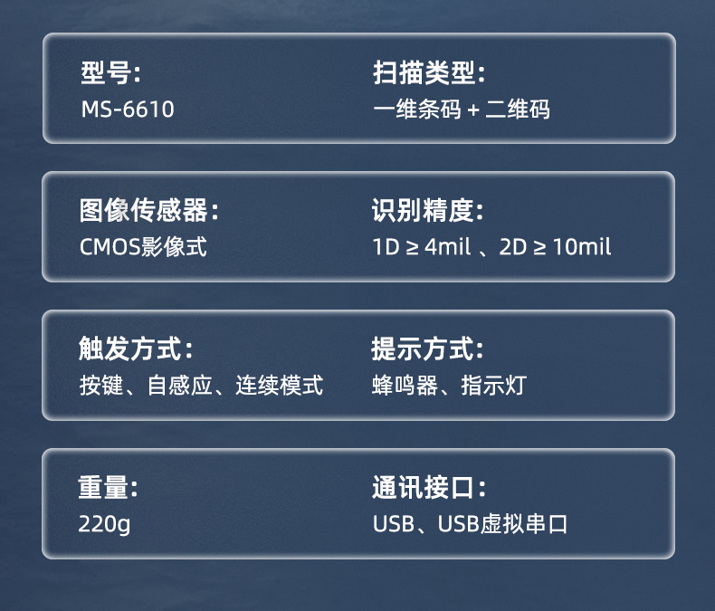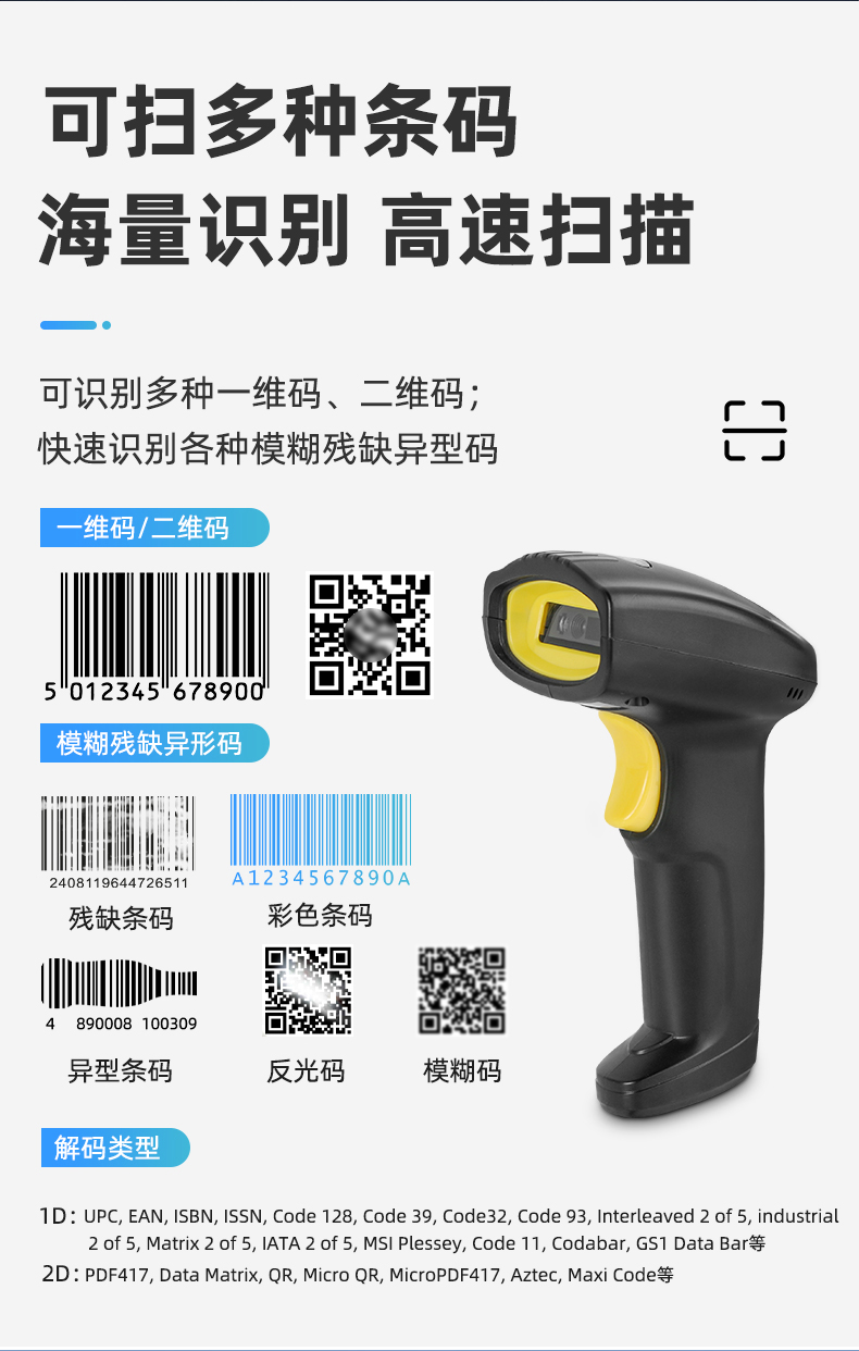 產(chǎn)品特點(diǎn): 全局高速解碼技術(shù) 采用自主研發(fā)的核心技術(shù),極速響應(yīng), 支持快速開(kāi)發(fā)和定制需求 采用二維掃描技術(shù) 兼容一維碼和二維碼的讀取 手機(jī)和紙質(zhì)條碼讀取 采用高速曝光算法,兼容手機(jī)碼和紙質(zhì)碼的快速讀取 支持多國(guó)鍵盤(pán) 對(duì)不同國(guó)家場(chǎng)景可配置對(duì)應(yīng)輸出鍵盤(pán) 人體工學(xué)設(shè)計(jì) 采用經(jīng)典的人體工學(xué)設(shè)計(jì),符合用戶使用習(xí)慣 全ASCII數(shù)據(jù)編輯 支持全ASCII數(shù)據(jù)編輯,可配置輸出結(jié)果格式 支持開(kāi)票模式 可配置為開(kāi)票模式,實(shí)現(xiàn)發(fā)票碼格式轉(zhuǎn)換及輸出